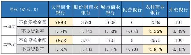銀監(jiān)會(huì)2017年發(fā)布的最新數(shù)據(jù)顯示,2017年二季度末,商業(yè)銀行(法人機(jī)構(gòu),統(tǒng)計(jì)口徑)不良貸款余額1.64萬(wàn)億元,較上季末增加563億元;不良貸款率1.74%,與上季末持平。其中農(nóng)村商業(yè)銀行不良貸款率為2.81%,較上季末增長(zhǎng)0.26%。另外,二季度末,全國(guó)農(nóng)村信用社不良貸款余額和比例分別為5755億元及4%,不良貸款同比下降0.2%。